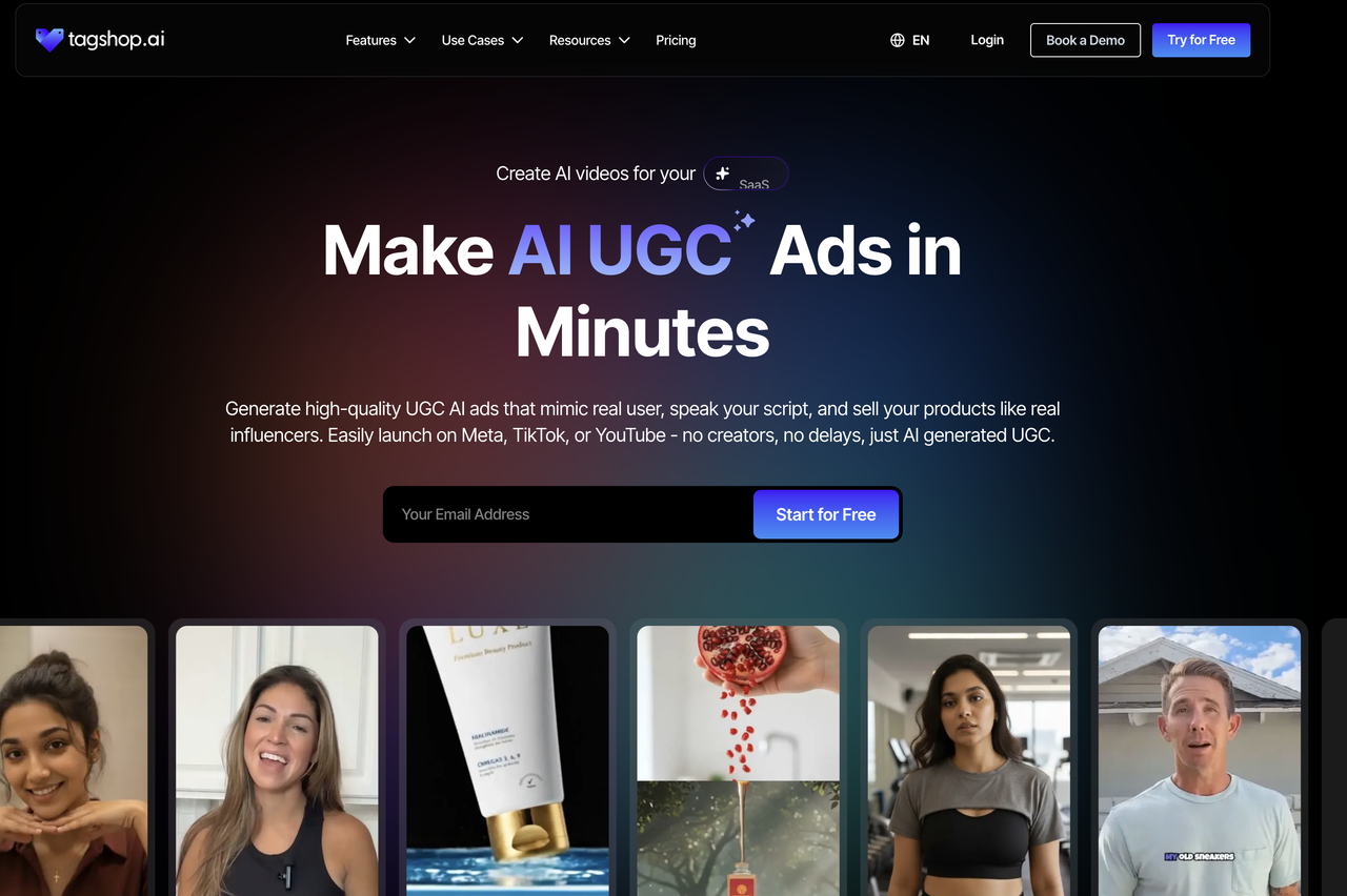 Tagshop uses generative AI to create photorealistic avatar-based videos from your product URL. No filming, no hiring creators—just input your product and let AI generate dozens of variations.
